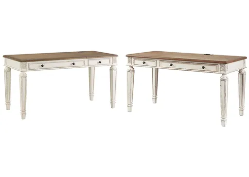 Elevating the art of traditional cottage styling, this desk set duo is your heavenly home office realized. An antiqued two-tone aesthetic blends a chipped white with a distressed wood tone top for added charm. Framed drawer fronts, decorative corbels and elegantly turned and tapered legs add refinement, while dark bronze-tone knobs lend a classic touch. One desk features a spring lift top which raises the surface to a comfortable standing position, while the second desk caters to computer work with a drop front keyboard tray. Each desk is equipped with built-in charging to keep your devices close at hand and ready to go.