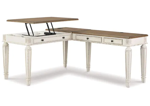 Elevating the art of traditional cottage styling, the Realyn L-shaped desk is your heavenly home office realized. Its two-tone finish combines chipped white with distressed wood tone tops for added charm. Framed drawer fronts, decorative corbels and elegantly turned and tapered legs add refinement, while dark bronze-tone knobs lend a classic touch. And this desk is also built for productivity. A spring lift top raises the surface to a comfortable standing position, while the built-in power supply and dual USB ports keep your devices close at hand and ready to go.