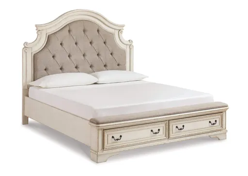 Redefining the art of traditional cottage styling, the Realyn king upholstered bed is your dream bedroom retreat realized. The ornately shaped headboard with inset upholstered cushion brings cozy charm. Framed drawer fronts on the footboard add refinement, while drawer pulls in a dark bronze-tone finish lend a classic touch. A cushioned top rail elevates this stylish addition to a functional favorite.