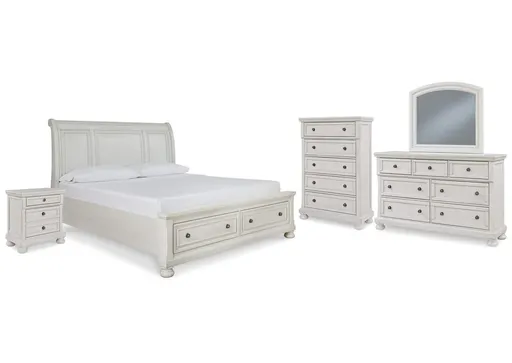 Elegant, timeless furnishings take your bedroom to the next level. Nothing does that better than the Robbinsdale bedroom package. The antiqued white finish with a wonderful grain texture oozes sophistication, while dark bronze-tone hardware adds a sophisticated touch. Felt-finished top drawers on the dresser, chest and nightstand round out the set for the ultimate tasteful bedroom.
