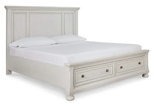 Elegant, timeless furnishings take your bedroom to the next level. Nothing does that better than the Robbinsdale queen panel storage bed. The antiqued white finish with a wonderful grain texture radiates sophistication, while the dark bronze-tone hardware adds an ornate touch to the handy storage drawers.