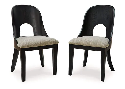 Inspired by art deco design, the Rowanbeck dining chair makes a lasting impression in a simply stunning way. Its magnificent curved silhouette is enhanced with a rich layered black finish on the textured wood grain surface. The chair's ultra-sleek bent back is contoured for comfort, and the cushioned seat is wrapped in herringbone-patterned upholstery that’s so pleasing to the palate. This is the piece you’ve been seeking to elevate your contemporary decor whether you’re dining, listening to your latest playlist or binge-watching with friends.