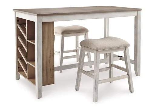 Raise the bar on small space living with the Skempton 3-piece counter-height dining set. An inspired choice for coastal chic or modern farmhouse settings, this strikingly simple table marries a brown tone plank-effect top with a rubbed-through grayish white base for timeworn appeal. The table’s side shelves and 8-bottle wine rack cleverly balance form and function while the comfortably cushioned bar stools serve up high style.