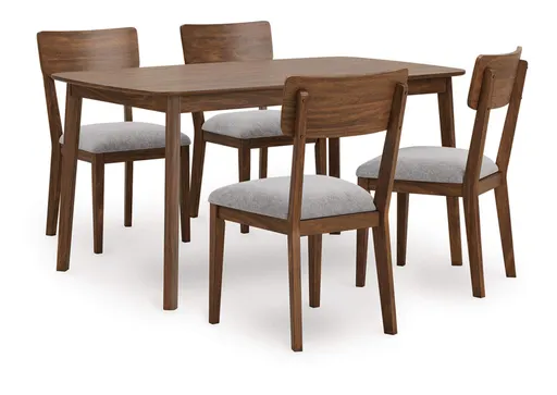 A refreshed take on retro aesthetics. This table and chairs set adds an air of playful simplicity to your dining space, capturing the architectural language of mid-century stylings. Subtly dynamic in design, it invites the eye with its curved backrests and contrasting light gray cushions. A casual, yet timeless, finish on the table and chair frames completes this study in form and function.