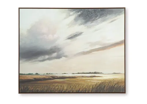 Sure to make an impression in casually chic spaces, the Taymen wall art invites you to admire the expansive beauty of nature. Its landscape design transports you to a field of rolling grain with the sky stretching out above. Hand-painted embellishments provide the finishing touch.
