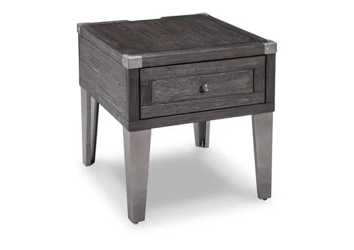 Take a stance for rustic-industrial style with this mixed material end table. Weather-washed pine wood and veneers are contrasted with canted metal legs and corner bracket accents for a uniquely chic merger of earthy beauty and contemporary flair. Power plug-ins and USB charging ports mounted on the back add practical function to great form.