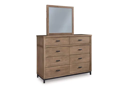 Sleek in its simplicity, the Tomtyn dresser and mirror set takes a relaxed approach to refinement. Its mixed-material design brings a trendy urban-chic feel to your morning and nighttime routines, while functional features keep your bedroom clutter-free. Clothes and linens are easily tucked away in the smooth-gliding drawers.