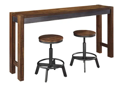 Stretch the possibilities of small space living with the Torjin 3-piece long counter table set with two retro-cool stools. Two-tone finish scheme of distressed warm brown and aged gunmetal is full of urban industrial swagger. Long length makes it suitable for 3 people to sit. Place behind your sofa for a chic eating or working space.