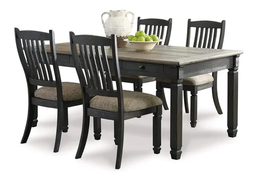 Set your sights on the Tyler Creek dining set. The rectangular table, with six drawers for storing away smaller items, beautifully suits your storage needs. Its timeworn planked oak top creates a unique two-tone contrast with tapered legs in a heavily textured black and oak finish. Four solid wood upholstered dining chairs with slat backs complete this winning combination.