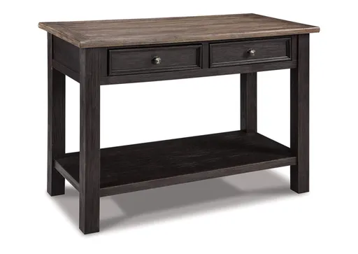 Shabby chic with a hint of down-home country, the Tyler Creek sofa table is all the talk of today’s design world. Wood grain shows through the weathered gray-brown top in all of its earthy pleasure. And the framed drawers, adorned with lovely traditional hardware, make it easy for you to store your belongings in style.