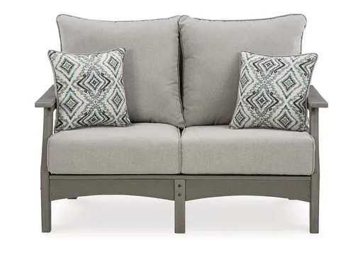 It’s the dawn of a new day for gray. Embrace the style trend with the Visola outdoor loveseat. Crafted of HDPE material that combines the exceptional durability and weather resistance you need with the “wood look” you love, this comfortably cushioned loveseat takes outdoor living to a whole new level. Rest assured, the thick seat and back cushions and throw pillows are wrapped in our exclusive Nuvella® high-performance fabric that’s fade resistant, stain resistant and a breeze to clean.