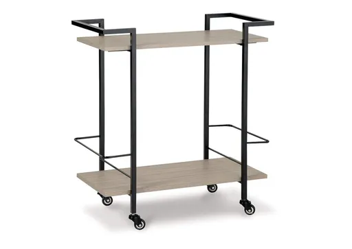 Contemporary meets casual to create the ultimate spot to serve and display. Crafted of durable MEGA-TUFF® melamine with a light natural wood grain effect, the Waylowe bar cart sets a new standard for substance and streamlined design. Black bottle holders keep spirits secured in style, while locking casters add easy mobility to the relaxed-yet-modern piece.