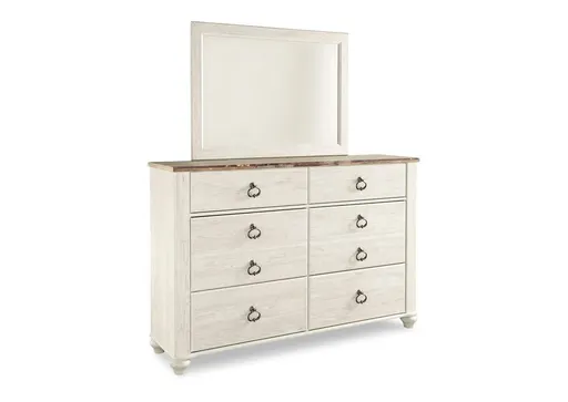 The Willowton dresser and mirror set is the ultimate statement piece for your coastal cottage or shabby chic inspired retreat. A whitewash finish on the drawers and sides is wonderfully easy on the eyes. Paired with the unique faux plank top, it’s a driftwoody look that has our minds drifting away to beachy-keen escapes.
