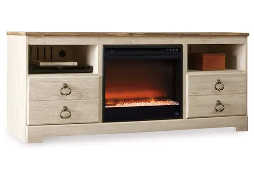 This TV stand with fireplace insert is the ultimate statement piece for a coastal cottage or shabby chic inspired retreat. Whitewashed finish is wonderfully easy on the eyes. Paired with the TV stand’s unique plank-style top, it’s a driftwoody look that has our minds drifting away to beachy-keen escapes. Adding that much more show-stopping style, the electric fireplace insert operates with or without heat and includes a six-level temperature setting, a remote control and an overheating control for added safety. It comes with faux glass crystals and natural stones, so you can customize the look of the flame bed.