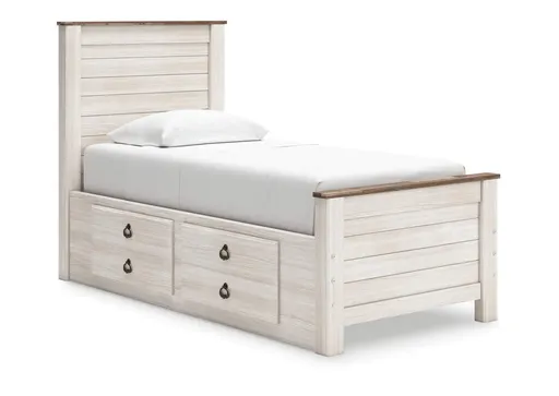 The Willowton twin panel bed with storage is the ultimate statement piece for a coastal cottage or shabby chic inspired retreat. Its whitewash finish is wonderfully easy on the eyes. Faux plank cap rails on the headboard and footboard infuse a driftwoody look that has our minds drifting away to beachy-keen escapes. Two smooth-gliding drawers keep linens, blankets and jammies close at hand. Mattresses available, sold separately.