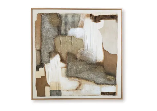 The Wylander wall art brings a fresh and comforting feel to modern spaces. Flowing brushstrokes in serene shades of tan, brown, gray, and ivory create an abstract design full of organic movement. Fabric embellishments are layered with hand painted details. And when you need a change in perspective, this piece can hang four ways to switch up its styling.
