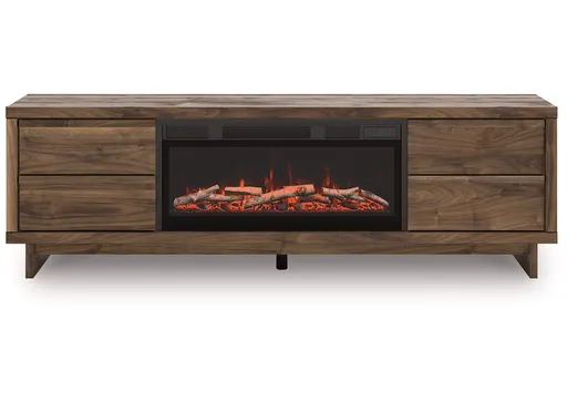 Nostalgic style, retooled for today’s trends. The Zadilyn TV stand with electric fireplace puts an elevated twist on mod aesthetics. Its warm brown tones reflect the mid-century vibes you love, while the angular base incorporates contemporary motifs. Integrated drawer handles round out the look in sleek style. For added ambiance, the electric fireplace brings a cozy-cool vibe to your living room. With the touch of a button, activate the LED-lit flame and adjust the temperature or the flame brightness. The flame effect includes multiple color options and a realistic-looking faux birch log set.