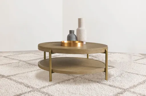 This round coffee table combines modern design with rustic charm, perfect for today’s living spaces. Crafted with rubberwood, engineered wood, and ash veneer, its smooth finish highlights the natural wood grain for an organic appeal. The lower shelf features woven rattan, offering practical storage and a textured look. Supported by aged brass-finished metal legs, this cocktail table delivers a balance of durability and style, serving as a functional centerpiece for any living room or lounge area.