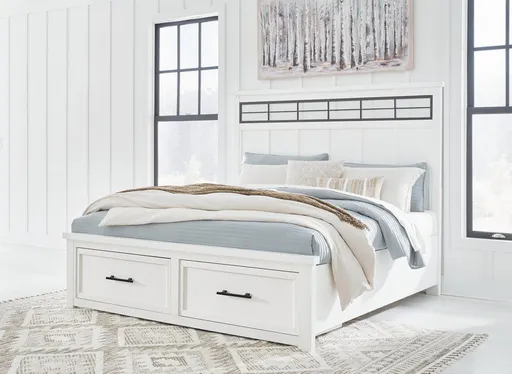 This queen panel storage bed delivers casual style with substance. An inset metal detail on the headboard displays a unique take on modern farmhouse design. The bed's sturdy silhouette, classic white finish and black pulls exude a comfortably cozy vibe in your soothing sanctuary. Storage drawers are spacious enough for all your essentials.
