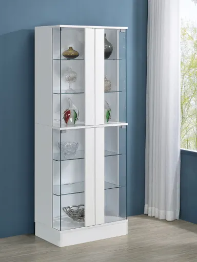 Discover sophistication and functionality fused in this sleek curio display cabinet, a stylish centerpiece for any room. The high gloss laminate on engineered wood gives a luminous sheen, complemented by clear tempered glass doors that encase six tiers of shelving. Each shelf basks in the glow of integrated LED lights, perfect for showcasing your treasures with a touch of modern elegance. The two-door design invites a clear view into your curated collection, while the robust construction promises longevity. This cabinet is not just furniture; it's a statement of refined taste and practical luxury. Key Features: • Curio display cabinet with clear tempered glass doors • Frame features white high gloss laminate on engineered wood • Two-door design with six tiers of shelving for ample display space • Each shelf equipped with its own LED light to enhance display visibility • High gloss finish offers a modern and clean aesthetic appeal