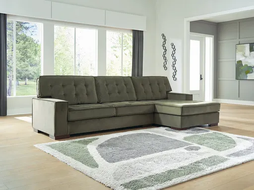 This sleek sectional with chaise offers a highly contemporary look with plenty of space to spread out. Dramatic tufted detailing and luxurious upholstery in a rich olive color create a sophisticated atmosphere. This sectional is perfect for those who love to entertain, or simply relax, in uptown style and comfort. More About This Product Product Details