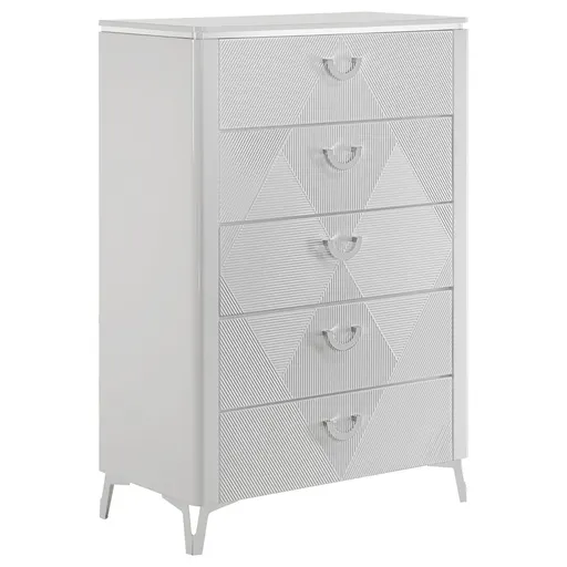 With a sleek high gloss finish and sculptural texture, this five-drawer chest makes a striking addition to the modern bedroom. Its geometric drawer fronts feature ribbed V-patterns that shift across each tier, accented by polished chrome U-shaped pulls. The top drawer is lined in black felt for delicate storage, while all drawers operate smoothly on 45mm metal extension glides. Elevated on tapered chrome-finished legs, this chest offers elevated storage with sharp visual impact. Key Features: • Five-drawer chest in white high gloss finish with sculptural ribbed geometric drawer fronts • Top drawer is fully lined in black felt to protect jewelry and delicate items • 45mm metal extension drawer glides ensure smooth and consistent drawer performance • Polished chrome U-shaped pulls add sleek contrast to textured sculptural surfaces • Tall vertical form provides generous storage in a modern, compact footprint • Crafted from engineered wood for style, structure, and longevity