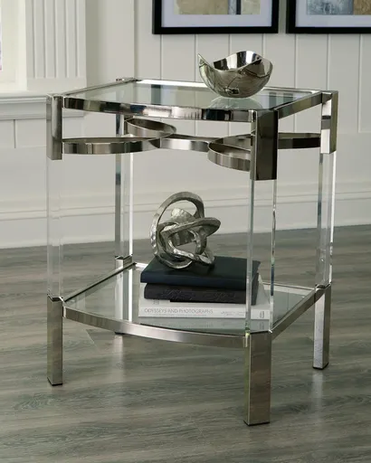 If you love the idea of total transparency, this accent table is surely a sight for sore eyes. Crafted of clear acrylic, the glass top and open glass shelf is beautifully on trend. Sleek chrome plated metal legs with clear acrylic accents add a touch of elegance to your mid-mod vibe.