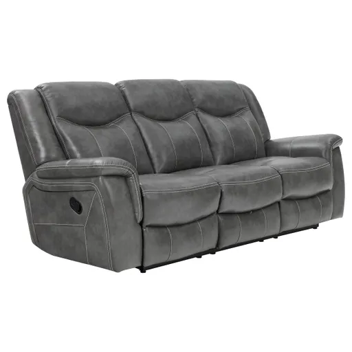 Bring luxury and convenience to your living room with this reclining sofa upholstered in smooth grey faux leather. Designed with plush padded seating, headrests, and armrests, it ensures exceptional comfort. The drop-down centre table reveals dual cup holders, a pop-up power outlet with two AC and two USB ports, and a hidden storage drawer for added practicality. A wall-hugger mechanism saves space, while a one-inch cool gel memory foam topper enhances softness for an upgraded lounging experience. Key Features: • Manual reclining sofa with smooth wall-hugger space-saving design • Grey faux leather upholstery adds sleek, modern visual appeal • Drop-down centre table includes two cup holders for convenience • Pop-up power outlet with dual AC and USB ports enhances utility • Hidden storage drawer keeps remotes and accessories organised • Cool gel memory foam topper delivers long-lasting comfort
