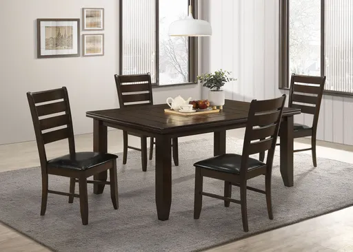 A perfect balance of durability and timeless appeal, this dining set includes a plank-style dining table paired with matching solid wood chairs for a cohesive look. The ladder-back chairs provide ergonomic support, while the padded seats ensure a comfortable dining experience. Designed for everyday meals and special occasions, this set blends versatile functionality with classic design, making it ideal for a variety of dining room styles. Key Features: • Elegant dining set includes a plank-style dining table and coordinating chairs • Rich cappuccino finish complements a variety of traditional and modern spaces • Padded seats upholstered in black faux leather provide style and comfort • Solid rubberwood frame ensures lasting durability and everyday reliability • Ladder-back chair design enhances both aesthetic appeal and ergonomic support • Strong table legs and chair frames provide excellent stability for family meals