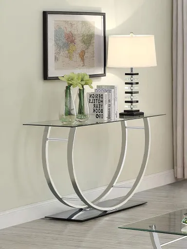 This modern rectangular console table showcases a clear tempered glass top paired with a sleek mirrored base, creating a polished, contemporary appeal. The curved frame, crafted from heavy gauge electroplated chrome metal, adds a touch of sophistication and elegance. Built with durable materials, this console table is perfect for entryways, hallways, or behind sofas, offering a striking, functional piece that enhances any modern space while ensuring lasting quality. Key Features: • Rectangular console table with a clear, durable tempered glass top • Reflective mirrored base adds a sophisticated, modern visual element • Heavy gauge metal frame with electroplated chrome finish for durability • Stylish curved design enhances the aesthetic of contemporary interiors • High-quality materials ensure strength and long-lasting use • Perfect for entryways, hallways, or behind sofas with modern appeal