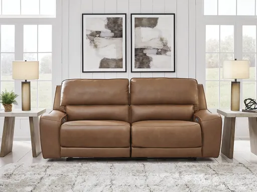 Live and lounge luxuriously. This power reclining sofa brings an ultra-stylish flair to your home’s central hub. Its seating area is wrapped in top-grain leather in a rich caramel coloration, giving you a trend-right look made all the better with high-quality materials. And with the simple push of a button, you can recline or adjust the headrests to find your ideal comfort position.