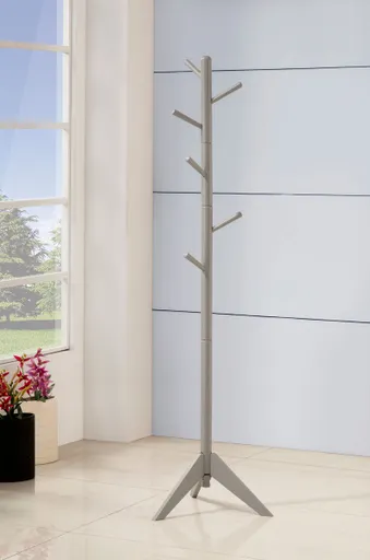 Bring a visual lift to a transitional space. Outerwear finds a perfect resting place on this coat rack. Positioned in an entryway or main living area, its charming silhouette is artistic and fun. Find space on six slanted hooks to hang coats, sweaters, hats, and scarves. Choose a finish that complements your custom space. Key Features: • Freestanding coat rack includes six staggered angled hooks • Slim profile and tripod base ideal for entryways and corners • Finished in grey for a neutral, transitional style statement • Solid rubberwood construction ensures daily durability • Compact scale suitable for bedrooms, dorms, or shared foyers • Easy-to-move design makes it versatile across home spaces