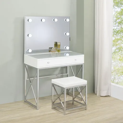 Elevate your morning rituals with a compact, contemporary vanity set, including table, mirror and stool. Perfect for makeup and hair, the vanity shows off a bright white finish with a large drawer for stashing your daily necessities. On top, a lighted mirror adds Hollywood glamour while providing bright illumination so you can see every detail as you get ready for everything from running errands to a girl's night out. The desk is accompanied by a backless stool, providing an easy spot to sit as you prepare for the day. The stool features a base with X-shaped braces to match the desk and includes a white faux leather seat with lovely padding that starts your day on the right foot. Key Features: • Bright white finish with a large drawer for stashing your daily necessities • Lighted mirror adds Hollywood glamour while providing bright illumination • Desk is accompanied by a backless stool with X-shaped braces and a white faux leather seat with lovely padding • Compact and contemporary design perfect for makeup and hair • Easy to assemble and maintain for long-lasting use