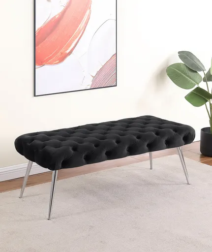 Enhance your living area, bedroom, or entryway with this sophisticated bench, skillfully blending timeless tufting and plush upholstery for a luxurious look and feel. Its meticulous button-tufted top adds depth and dimension, while slender metal legs provide stable support and a touch of modern refinement. Designed to complement various interiors, this versatile piece can function as extra seating, a footrest, or a decorative accent, effortlessly elevating your home’s ambiance. Key Features: • A statement bench with luxurious, soft-touch black velvet upholstery • Intricate button-tufting for a classic, refined aesthetic • Polished stainless steel legs ensure a chic, contemporary appeal • Plush cushioning for comfortable seating or lounging • Sturdy frame construction for reliable, everyday use • Perfect as extra seating, a hallway accent, or a stylish footrest
