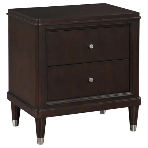 Accentuate bedroom decor with the chic look and impressive functionality of a modern two-drawer nightstand. Its sleek look is accentuated with delicate trim and petite round knobs on each drawer. A dark brown finish ensures a versatile palette, complementing in a variety of bedroom settings to create a warm, soothing ambiance. The top drawer includes felt lining and the bottom drawer cedar, adding protection to your bedside storage. Tapering feet complete the look with metallic finish caps, offering a touch of contrast and depth at your bedside. Key Features: • A contemporary two-drawer nightstand offers stylish bedside storage and a refined look and feel • Rich brown wood finish creates a neutral, sophisticated for a stylish bedroom ambiance • Tapering feet feature metallic finish caps that match round knobs on the drawers • Top drawer includes felt lining in a red-brown color for added protection for delicate items • Bottom drawer includes cedar lining to protect against pests