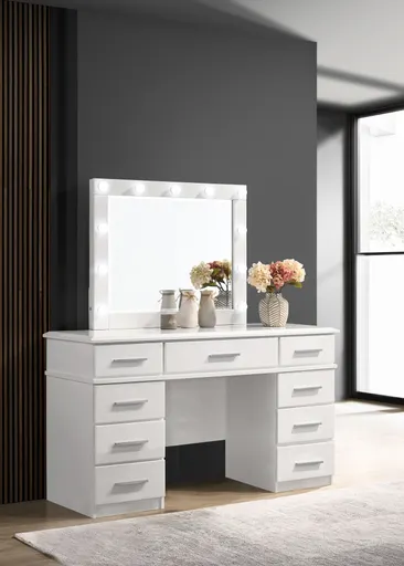 Brighten your dressing space with this contemporary vanity table and mirror set. Finished in a white high gloss for a sleek, polished effect, it features nine spacious drawers lined with felt to keep cosmetics, jewelry, and accessories neatly organized. Smooth metal extension glides ensure easy access, while chrome bar pulls add modern appeal. Topping the vanity is a beveled mirror outlined with eleven Hollywood-style LED lights, offering brilliant illumination for flawless makeup application and styling.