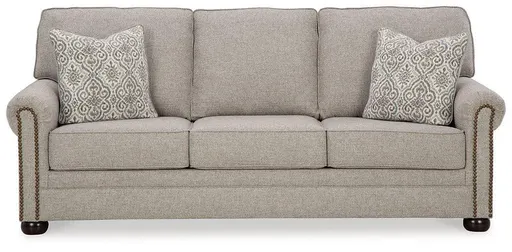 Inspired by the past but rooted firmly in the present, this queen sofa sleeper complements your transitional seating area. Its versatile upholstery is delightfully detailed for a subtle herringbone effect. Designer touches like decorative nailhead trim and bun legs add traditional character. A handy pull-out mattress brings must-have function. With this sofa sleeper's reliable style and comfort, all you need to do is sit back and relax.