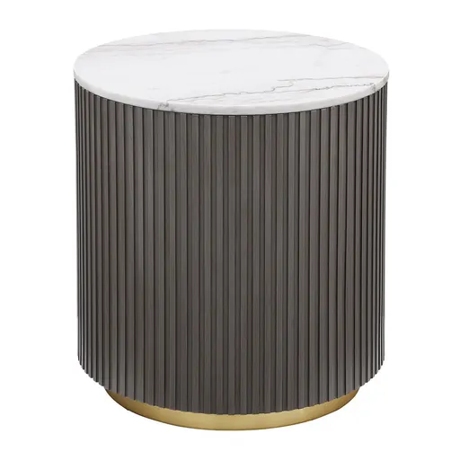 This round end table is the perfect complement to any living room setup. Its genuine white marble top, with delicate veining, brings an element of sophistication to your space. The engineered wood frame in a charcoal finish features ribbed detailing that adds texture and depth, while the brushed gold metal base ensures a luxurious foundation. This versatile side table seamlessly combines modern materials and a stylish design to elevate your home. Key Features: • Round end table with genuine white marble top and engineered wood frame • Ribbed design in charcoal finish adds texture and visual depth • Brushed gold metal base provides durability and elegance • White marble top with organic veining offers a sophisticated touch • Engineered wood frame ensures lasting stability and performance • Compact and versatile design ideal for any living room or lounge area