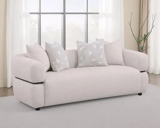 Sculptural and bold, this modern sofa pairs chunky contours with beautifully tailored detailing. Textured upholstery wraps a seamless waterfall bench seat, framed by a solid wood waistband that encircles the exterior. Pocket coil construction provides long-lasting support, while small bun feet complement the frame’s curvature. Down and feather blend accent pillows complete the look with softness and tonal contrast, making it ideal for eclectic interiors. Key Features: • Sofa with sculptural profile and tailored shaping offers a bold yet refined design • Beige fabric upholstery features textured softness and versatile modern appeal • Waterfall bench seat adds seamless flow with a well-kept tailored appearance • Solid wood waistband wraps the frame for structure and decorative elegance • Pocket coil seating delivers durable support and comfortable long-term use • Includes accent pillows for a designer-finished touch