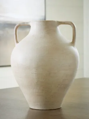 Crafted with care, this vase recalls the beauty of found artifacts. Its terra cotta construction and antiqued beige coloration lend a classic look and feel to the shapely silhouette. Slight differences in finish highlight the character and charm of each individual piece.