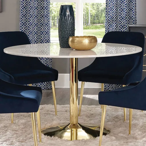 Add timeless sophistication to your dining space with this round dining table, featuring a luxurious white marble top and a radiant brass-finished pedestal base. The minimalist silhouette showcases modern elegance, while the subtle veining in the marble adds natural charm. With its geometric profile and warm metallic accent, this table makes a chic statement in contemporary or transitional settings. Key Features: • Round dining table with sleek white marble top for upscale appeal • Finished in gleaming brass for a warm, polished modern touch • Subtle marble veining brings organic character to the clean design • Crafted from durable engineered wood, genuine marble, and metal • Perfect for compact dining areas with a refined, contemporary aesthetic