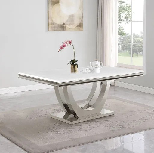 Host family and friends around this sleek, modern glam dining table for an elevated dining experience. Designed with an open demilune pedestal base in a lustrous polished chrome finish, this magnificent, rectangular dining table lends a luxurious look and feel to your space. A spacious tabletop is covered in a white marble paper and features a beveled edge that offers a timeless contemporary touch. The open pedestal base rests on a slim flush base that offers extra stability and a seamless expression. Seat six guests comfortably at this sophisticated dining table. Key Features: • Spacious rectangular table top is perfect for hosting six guests or family members • A white faux marble table top keeps a classic and clean expression to your dining space • An open pedestal base with a flush bottom offers sweeping elegant curves for a contemporary flair • A gleaming polished chrome finish lends a luxurious modern surface • The table top features a charming beveled edge for a timeless touch