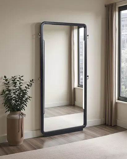 Bold in scale and softly contoured, this full-length floor mirror brings sculptural presence to any room. Framed in a deep burnished black finish with rounded corners, it offers a tall, uninterrupted reflection perfect for everyday use. Designed to lean securely against the wall, it also features integrated side hooks ideal for hanging garments, accessories, or daily essentials with subtle utility and style. Key Features: • Full-length floor mirror with burnished black frame and softly rounded corners • Lean-back design provides secure positioning against the wall without mounting • Tall reflective surface offers complete head-to-toe visibility • Integrated side hooks allow for hanging clothing, bags, or accessories • Sculptural shape and curved edges add subtle design character to any space • Crafted from Asian hardwood, engineered wood, and premium mirrored glass