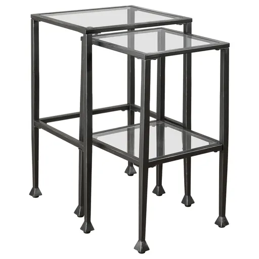 This two-piece nesting table set features sleek, modern design with clear tempered glass tops and shelves. The black powder-coated metal frame ensures durability and stability while enhancing the contemporary look of your living space. Perfect for compact areas, these tables can be conveniently nested when not in use and easily separated for versatile placement. Whether used as accent tables or side tables, their clean lines and minimalist design make them a practical and stylish addition to any home. Key Features: • Two-piece nesting table set with tempered glass tops and shelves for a modern aesthetic • Black powder-coated metal frame offers a sleek, durable finish and ensures lasting support • Clear tempered glass provides a polished, smooth surface while offering an open feel • Versatile design allows for easy nesting and separate use for added flexibility in your space • Sturdy construction with a metal frame and glass surfaces, perfect for everyday use • Simple, clean lines make this table set a stylish and functional addition to any living room