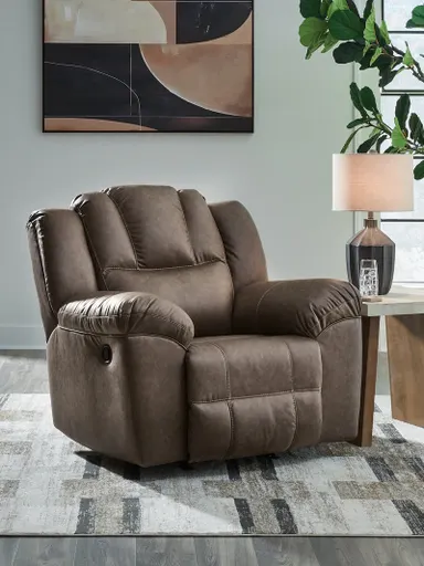 Ready to find your new favorite spot to unwind? This rocker recliner is designed for maximum indulgence, with plush, pillowy cushions that provide ultimate support. Wrapped in supple yet durable faux leather that’s easy to clean, it's just the ticket for movie nights and everyday life. And with one easy pull, you’re on your way to endless relaxation. Talk about the perfect blend of sink-in comfort and inviting contemporary style.
