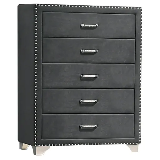 Three cheers for a chest that transforms your sleeping space. A five-drawer chest is readily equipped to store your garments while looking gorgeous. It's uniquely upholstered in velvet fabric for an extra luxurious impression. Nail head trim enhances the appearance while matching the tapered feet. This piece is a bold upgrade while offering a stylish storage solution.