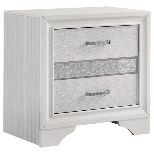 Infused with timeless glamour, this three-drawer nightstand brings refined character to any bedroom. Its linear profile is accented by elegant framing and a glittering center panel that conceals a hidden felt-lined drawer, ideal for delicate accessories. Smooth metal-extension glides ensure effortless drawer operation, while crystal-inspired pulls catch the light with radiant sparkle. Built from engineered wood and finished in a textured laminate veneer, it delivers durability with sophisticated transitional charm. Key Features: • Three-drawer nightstand with smooth full-extension glides • Hidden felt-lined drawer concealed behind glitter accent panel • Crystal drawer pulls enhance the glamorous design • Bright white finish with subtle textural detail on sides • Classic bracket base offers transitional styling • Crafted from engineered wood with laminate surfaces