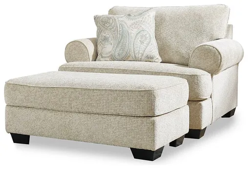This oversized chair and ottoman strike a beautiful balance between classic and current. The oversized chair’s traditional elements include t-cushion seating and setback roll arms, angled for modern flair. Jacquard paisley pillows make a muted, mellow complement to the chair’s casual textured chenille upholstery. Choice of sandstone beige is a light and lovely style awakening.