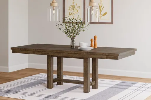 This dining room extension table elevates the art of casual rustic style. Clean-lined, farmhouse profile is beautified with a distressed nutmeg finish and thick planked effect top for added charm. And with not one but two drop-in leaves, you can easily accommodate eight with plenty of elbow room. More About This Product Product Details