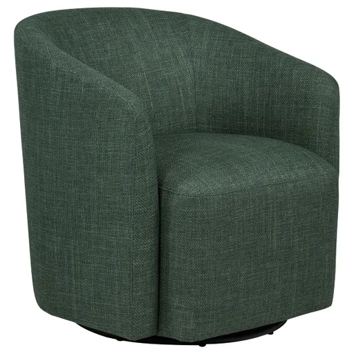 Compact comfort takes a refined turn in this swivel accent chair. Its rounded barrel back and seamless upholstery wrap the frame in sculpted softness, while a hidden swivel base adds dynamic functionality. Tailored for modern lounging, the foam-padded seat delivers support without bulk. With a space-conscious footprint and versatile silhouette, it effortlessly balances form and function in small living spaces or cozy nooks. Key Features: • Swivel accent chair with barrel-style back for modern lounge or reading nook use • Green fabric upholstery adds organic color and soft woven texture to the frame • Hidden swivel base allows smooth, quiet movement for everyday flexibility • Rounded arms and seat design enhance comfort in a sculpted contemporary form • Supportive foam cushion offers everyday softness in a space-saving size • Crafted from polyester fabric, foam padding, engineered wood, and a durable metal swivel mechanism